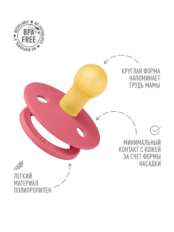 Пустышки BIBS изготавливаются из экологичных, на 100% безопасных материалов. Сосок у пустышки сделан из натурального каучука (латекса), а защитная накладка (шилдик) — из полипропилена. Изогнутая форма накладки минимизирует контакт с чувствительной и нежной кожей вокруг рта ребенка.