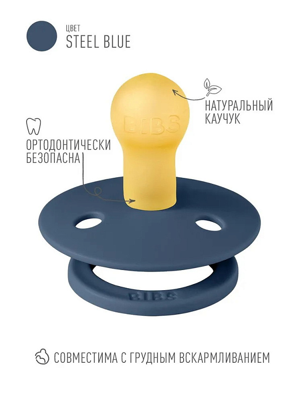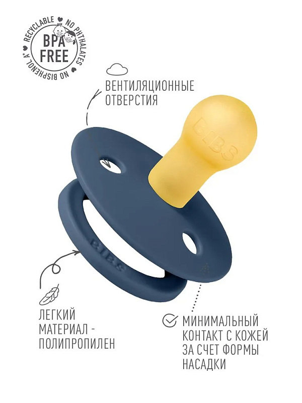 Пустышки BIBS изготавливаются из экологичных, на 100% безопасных материалов. Сосок у пустышки сделан из натурального каучука (латекса), а защитная накладка (шилдик) — из полипропилена. Изогнутая форма накладки минимизирует контакт с чувствительной и нежной кожей вокруг рта ребенка.
