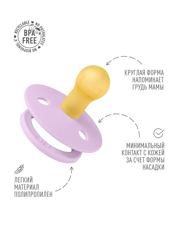 Пустышки BIBS изготавливаются из экологичных, на 100% безопасных материалов. Сосок у пустышки сделан из натурального каучука (латекса), а защитная накладка (шилдик) — из полипропилена. Изогнутая форма накладки минимизирует контакт с чувствительной и нежной кожей вокруг рта ребенка.