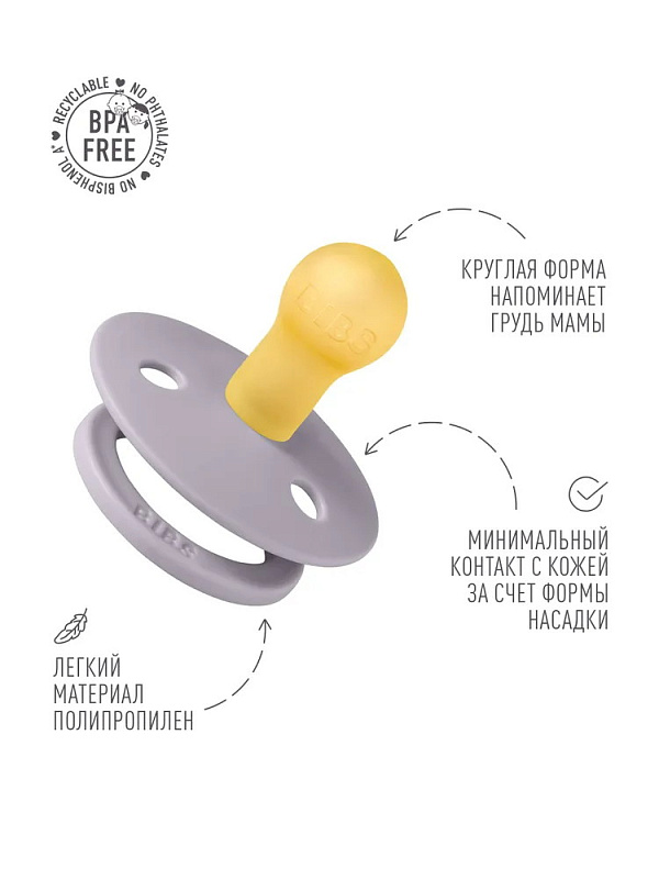 Пустышки BIBS изготавливаются из экологичных, на 100% безопасных материалов. Сосок у пустышки сделан из натурального каучука (латекса), а защитная накладка (шилдик) — из полипропилена. Изогнутая форма накладки минимизирует контакт с чувствительной и нежной кожей вокруг рта ребенка.
