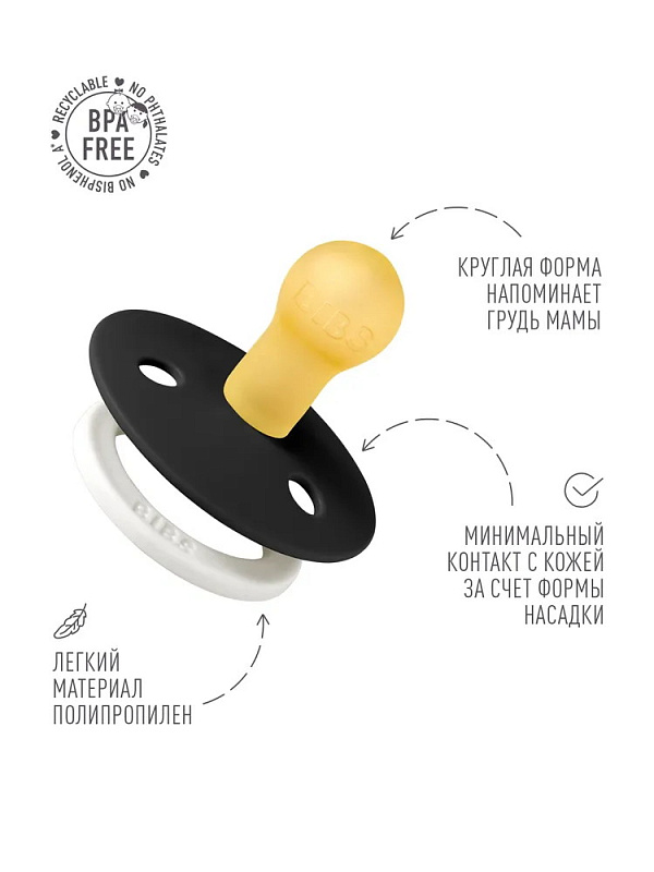 Пустышки BIBS изготавливаются из экологичных, на 100% безопасных материалов. Сосок у пустышки сделан из натурального каучука (латекса), а защитная накладка (шилдик) – из полипропилена. Изогнутая форма накладки минимизирует контакт с чувствительной и нежной кожей вокруг рта ребенка.
