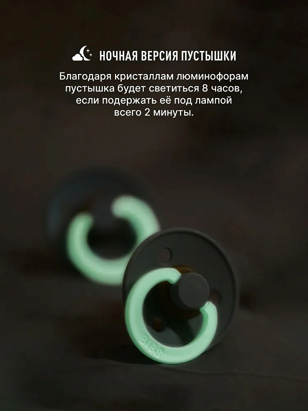 Пустышка Colour – это культовая пустышка BIBS, представленная на рынке с 1978 года. Колечко пустышки Colour Glow излучает мягкий свет и её легко найти в тёмной комнате. Достаточно двух минут под лампой, чтобы «зарядить» колечко. Свечение ему придают кристаллы люминофоров.