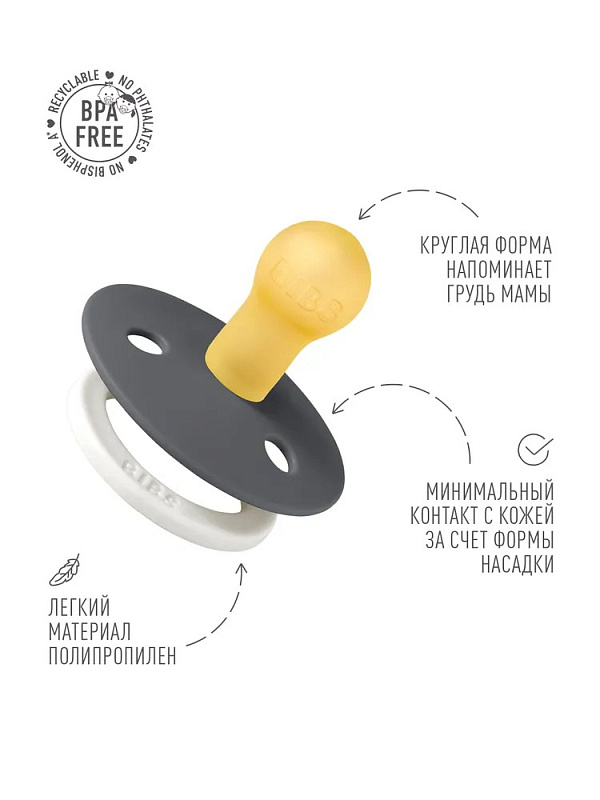 Пустышки BIBS изготавливаются из экологичных, на 100% безопасных материалов. Сосок у пустышки сделан из натурального каучука (латекса), а защитная накладка (шилдик) – из полипропилена. Изогнутая форма накладки минимизирует контакт с чувствительной и нежной кожей вокруг рта ребенка.