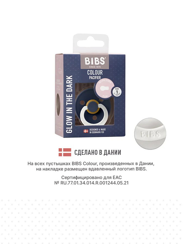 Пустышка Colour – это культовая пустышка BIBS, представленная на рынке с 1978 года. Колечко пустышки Colour Glow излучает мягкий свет и её легко найти в тёмной комнате. Достаточно двух минут под лампой, чтобы «зарядить» колечко. Свечение ему придают кристаллы люминофоров.