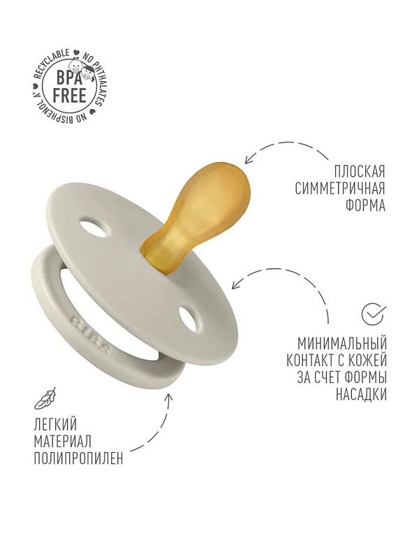 Пустышки BIBS изготавливаются из экологичных, на 100% безопасных материалов. Сосок у пустышки сделан из натурального каучука (латекса), а накладка (шилдик) — из полипропилена. Изогнутая форма накладки минимизирует контакт с чувствительной и нежной кожей вокруг рта ребенка.
