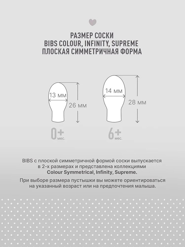 Пустышка Colour — это культовая пустышка BIBS, представленная на рынке с 1978 года. В связи с ростом популярности пустышки Colour, ассортимент данной модели дополнился соском симметричной и анатомической форм. Симметричный плоский сосок каплевидной формы способствует правильному положению языка во время сосания и развитию челюстно-лицевых мышц малыша. В каждой пустышке BIBS есть специальные вентиляционные клапаны, благодаря которым она является ортодонтически безопасной.