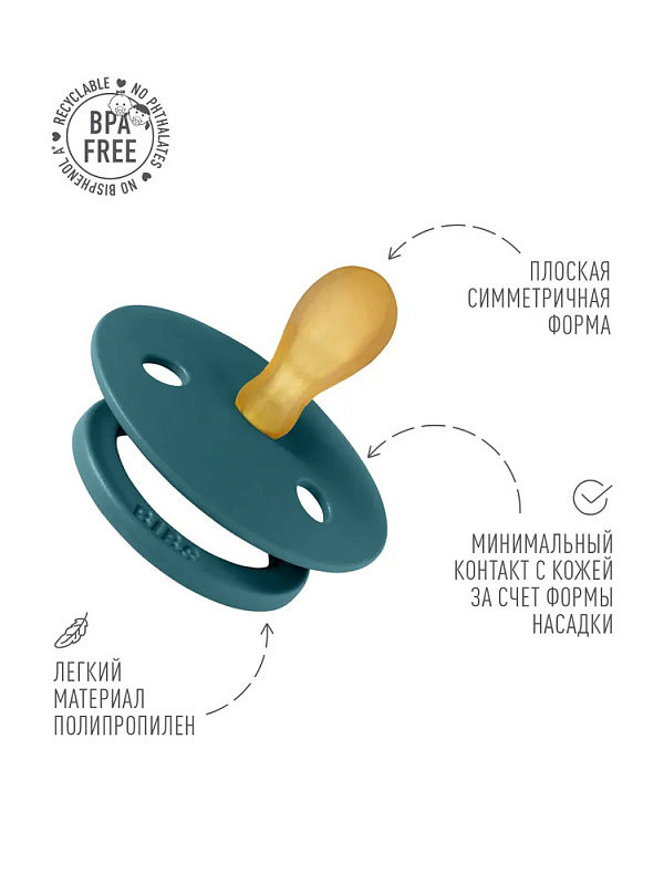 Пустышки BIBS изготавливаются из экологичных, на 100% безопасных материалов. Сосок у пустышки сделан из натурального каучука (латекса), а накладка (шилдик) — из полипропилена. Изогнутая форма накладки минимизирует контакт с чувствительной и нежной кожей вокруг рта ребенка.
