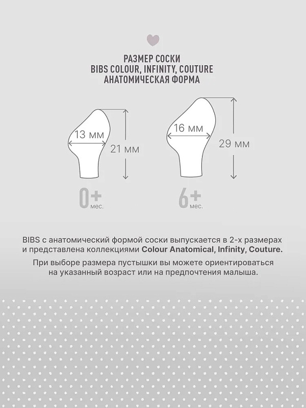 BIBS Couture — пустышка с привлекательным дизайном накладки и соском, который имеет изогнутую верхнюю часть для естественного прилегания к нёбу ребенка и скошенный кончик для удобного размещения языка. Форма накладки поможет правильно расположить соску во рту. В размере 0+ подходит для недоношенных детей.
