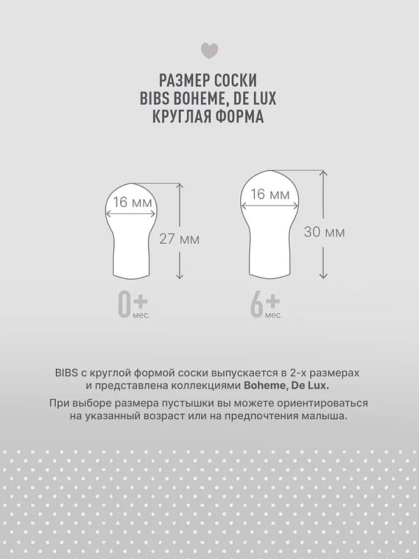Классический круглый сосок пустышки BIBS De Lux по форме и размеру напоминает сосок матери, благодаря чему она идеально подходит малышам с рождения и совместима с грудным вскармливанием.