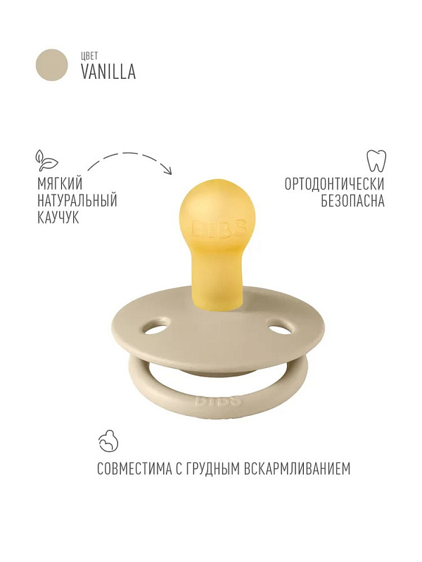 Пустышки BIBSизготавливаются из экологичных, на 100% безопасных материалов. Сосок выполнен из натурального каучука (латекса), а защитная накладка (шилдик) и ручка — из полипропилена. Изогнутая форма накладки с тремя круглыми отверстиями минимизирует контакт с чувствительной и нежной кожей вокруг рта ребенка.