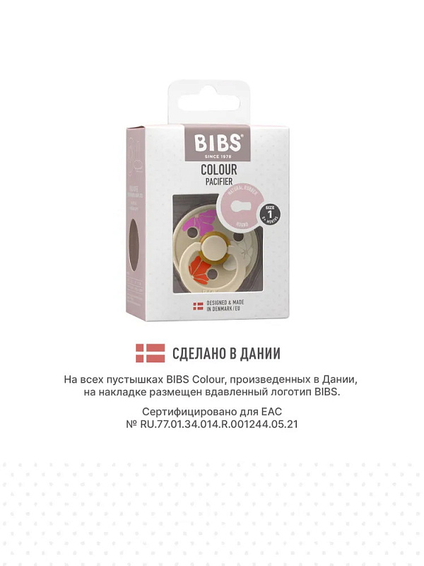 Пустышки BIBS изготавливаются из экологичных, на 100% безопасных материалов. Сосок у пустышки сделан из натурального каучука (латекса), а защитная накладка (шилдик) — из полипропилена. Изогнутая форма накладки с отверстиями минимизирует контакт с чувствительной и нежной кожей вокруг рта ребенка.