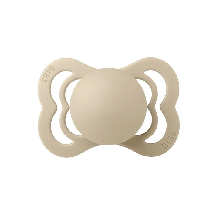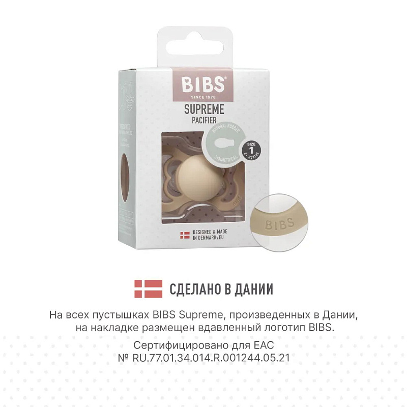 Пустышки BIBS изготавливаются из экологичных, на 100% безопасных материалов. Сосок выполнен из натурального каучука (латекса), а защитная накладка (шилдик) — из полипропилена. Форма накладки минимизирует контакт с чувствительной и нежной кожей вокруг рта ребенка.
