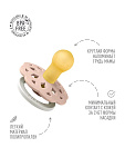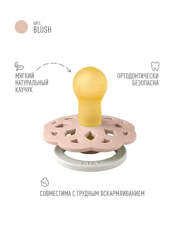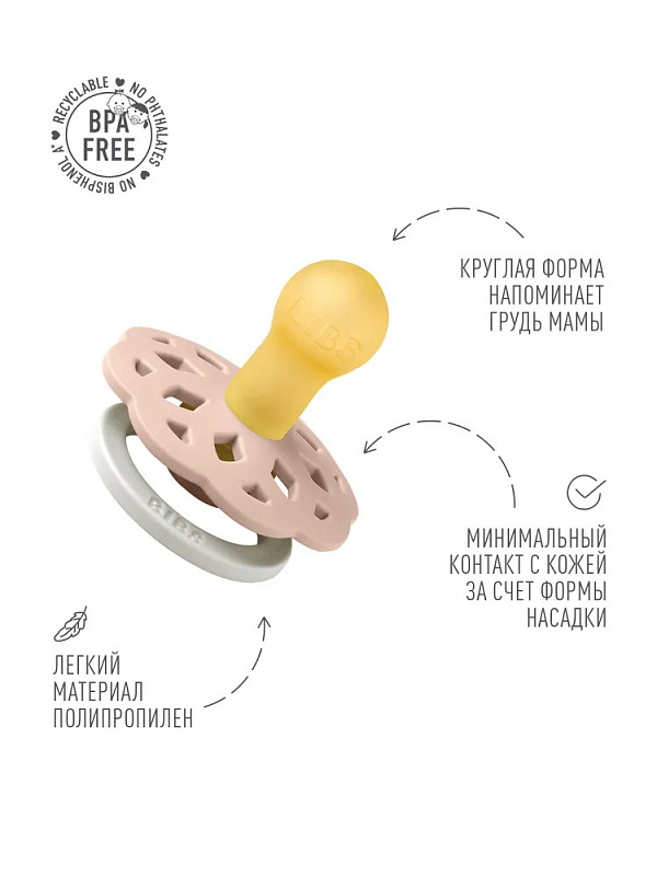 Пустышки BIBS изготавливаются из экологичных, на 100% безопасных материалов. Сосок у пустышки сделан из натурального каучука (латекса), а защитная накладка (шилдик) – из полипропилена.