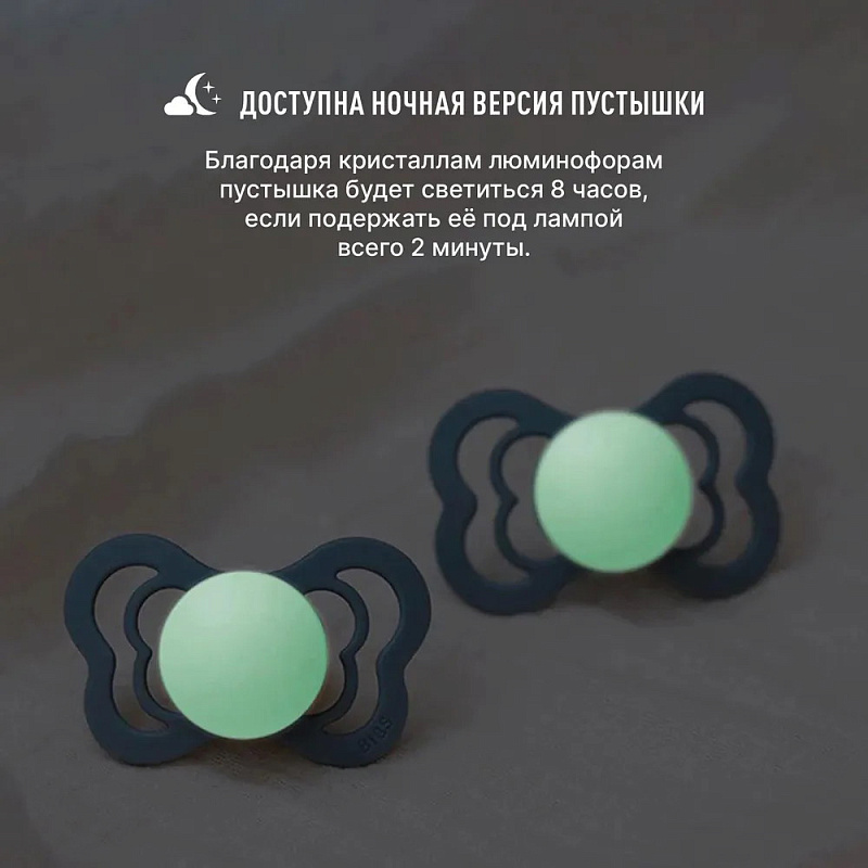 Накладка пустышки Supreme Glow излучает мягкий свет и её легко найти в тёмной комнате. Достаточно двух минут под лампой, чтобы «зарядить» пустышку. Свечение накладке придают кристаллы люминофоров.