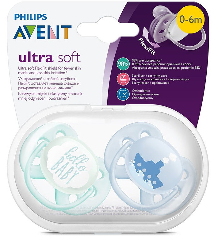 Пустышки Philips Avent серии ultra soft разработаны в сотрудничестве с медицинскими представителями и мамами. Новая серия пустышек отличается инновационным гибким нагубником с запантентованной технологией FlexiFit для предотвращения раздражений на нежной кожи ребенка. Мягкая и бархатистая соска пустышки нравится большинству малышей. В соответствии с потребительским тестом с 112 мамами, проведенным в США в 2016, 98% детей принимают пустышку ultra soft.