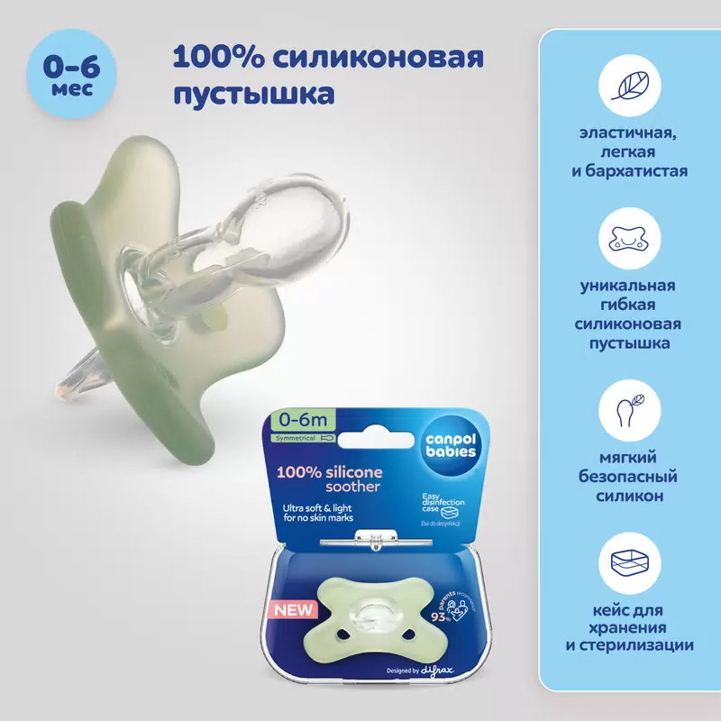 Пустышка из 100% силикона Canpol babies by Difrax расслабит и успокоит вашего малыша. Пустышка исключительно мягкая и легкая и не оставляет следов на лице ребенка. Изготовлен из 100% гипоаллергенного силикона – без запаха и вкуса. Мягкая эластичная соска симметричной формы хорошо прилегает к лицу ребенка независимо от того, как она расположена, а ее форма считается наиболее естественной. Большинству детей проще всего принять симметричную соску. Изготовлен полностью из одного куска гибкого силикона, который очень прочный, не деформируется, не высыхает и не обесцвечивается. Пустышка приятна для кожи благодаря шелковистому мягкому силиконовому покрытию. Специально разработанная форма нагубника хорошо адаптируется к лицу ребенка и позволяет легко дышать через нос. Дополнительные вентиляционные отверстия обеспечивают достаточный приток воздуха и предотвращают раздражение кожи. Силиконовая пустышка Canpol babies гигиенична и безопасна, ее легко содержать в чистоте – ее можно дезинфицировать в кипящей воде, в стерилизаторе, а также в прилагаемом кейсе для стерилизации в микроволновой печи. Пустышка легкая и удобна, идеально помещается в маленький ротик ребенка, а при охлаждении в холодильнике еще быстрее и эффективнее успокаивает ребенка во время прорезывания зубов. Пустышка имеет специальное отверстие, к которому можно прикрепить ленточку или цепочку, защищающую пустышку от потери, падения на землю и загрязнения.