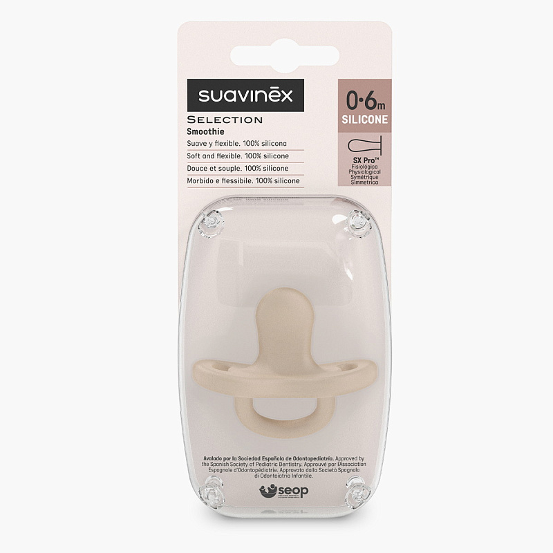 Физиологическая детская пустышка Suavinex Colour Essence SX PRO имеет особую конструкцию. Она располагается во рту ребенка таким образом, чтобы не препятствовать развитию естественного правильного прикуса. По бокам корпуса пустышки расположены вентиляционные отверстия, обеспечивающие хорошую циркуляцию воздуха. Это предотвращает раздражение нежной кожи малыша в области рта. Сверхмягкий силикон имитирует форму материнского соска, создавая у ребенка комфортные ощущения в процессе сосания. За счет пескоструйной обработки силикон надежно защищен от прилипания пыли и ворса.