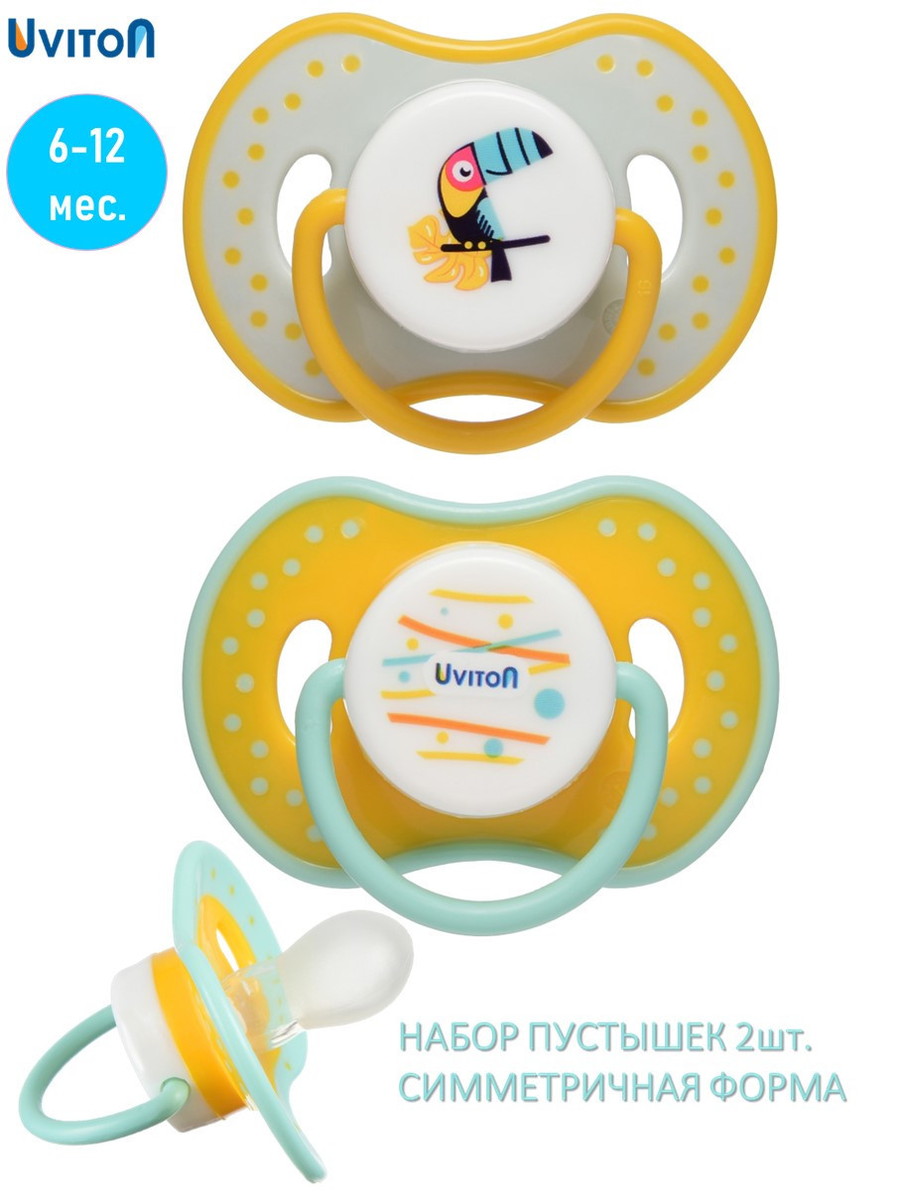Пустышка Uviton Zoo ортодонтическая c колпачком, 6-12 мес, 2 шт 0230/02 тукан
