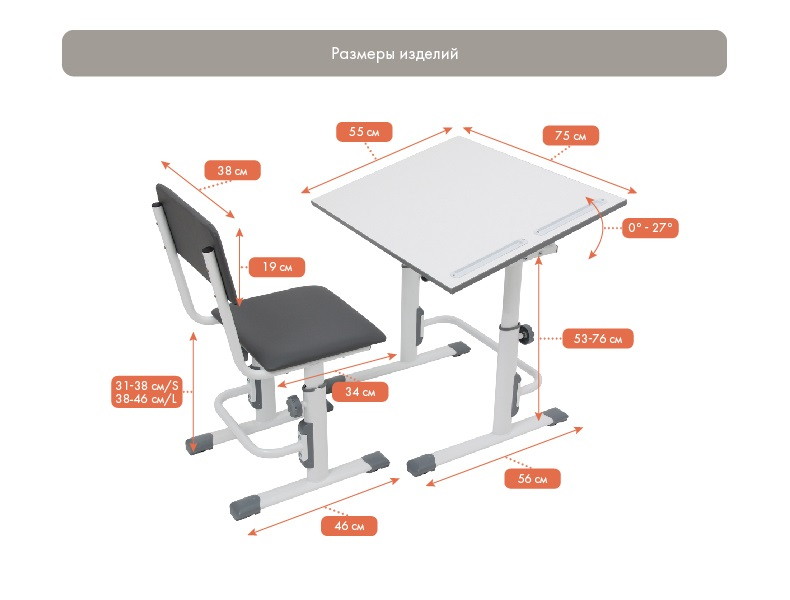 - регулировка наклона столешницы 6 положений: 0°/9°/13,5°/18°/22,5°/27°