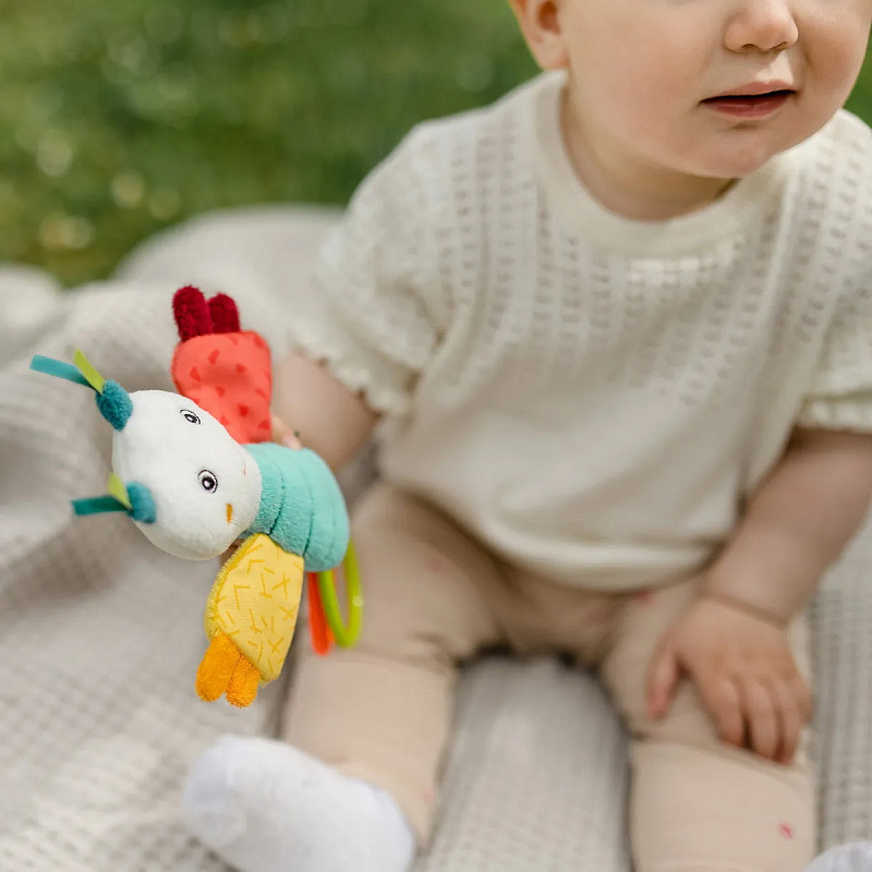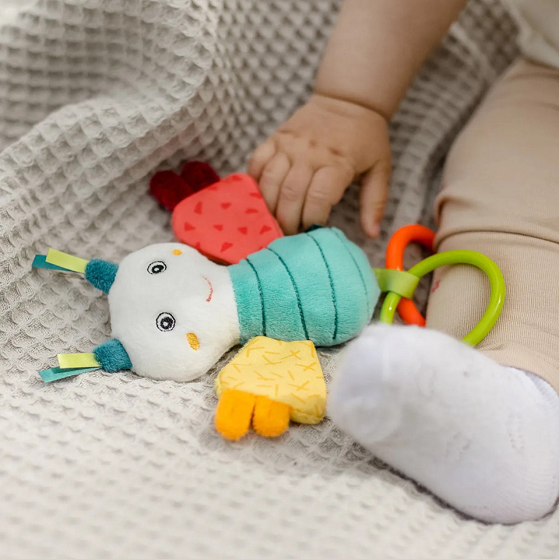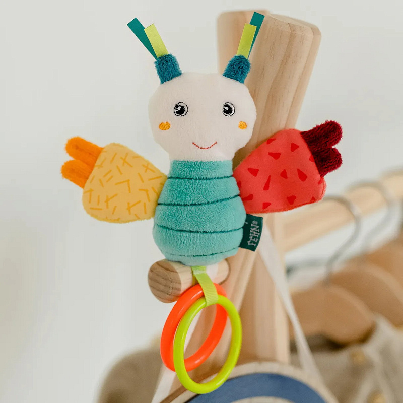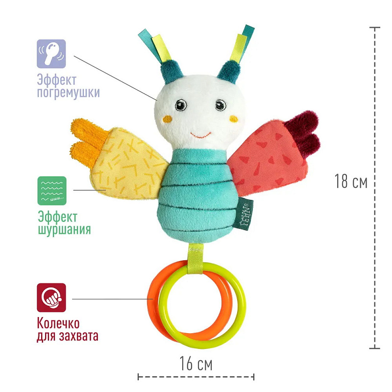 Яркая жизнерадостная бабочка – верный компаньон, с которым весело и интересно проводить время дома и на прогулке. За колечки удобно хватать и держать.