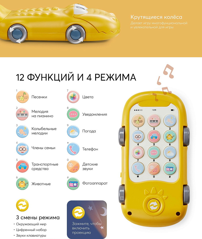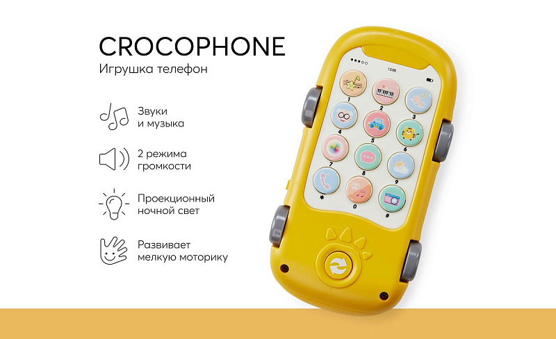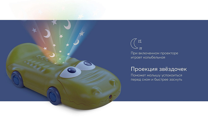 Игрушка телефон CROCOPHONE имеет 4 режима + 13 аналоговые кнопки с разными звуковыми эффектами. Также есть световые эффекты – проекция звёздочек, которая поможет малышу успокоиться перед сном. Благодаря колёсам, крокодильчика можно катать как машинку.