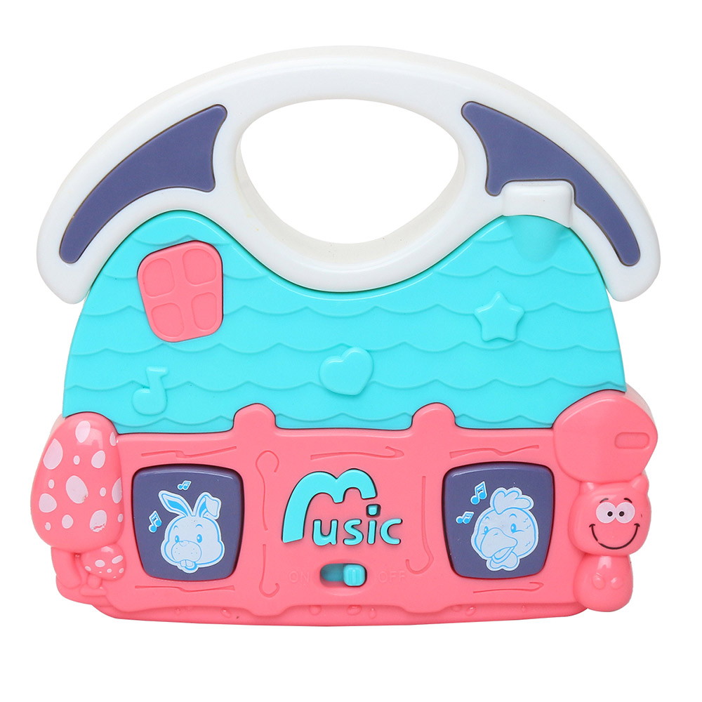 Развивающая игрушка представлена в виде домика и включает в себя 2 разноцветные клавиши с различными звуками (разных животных и мелодии) и светом.