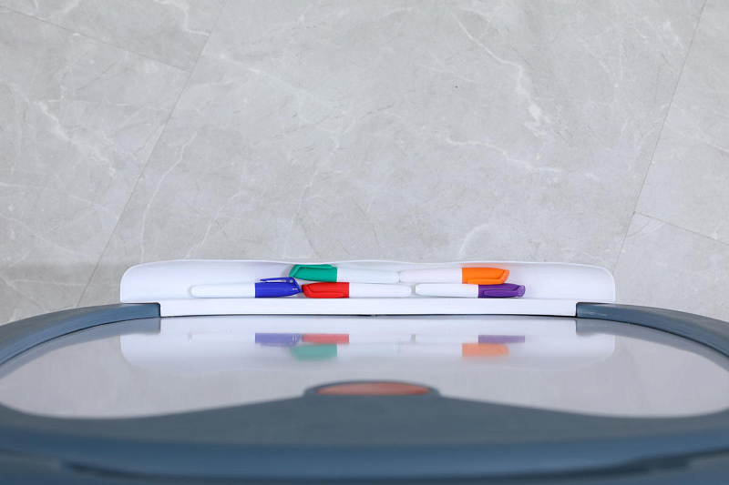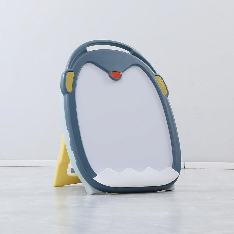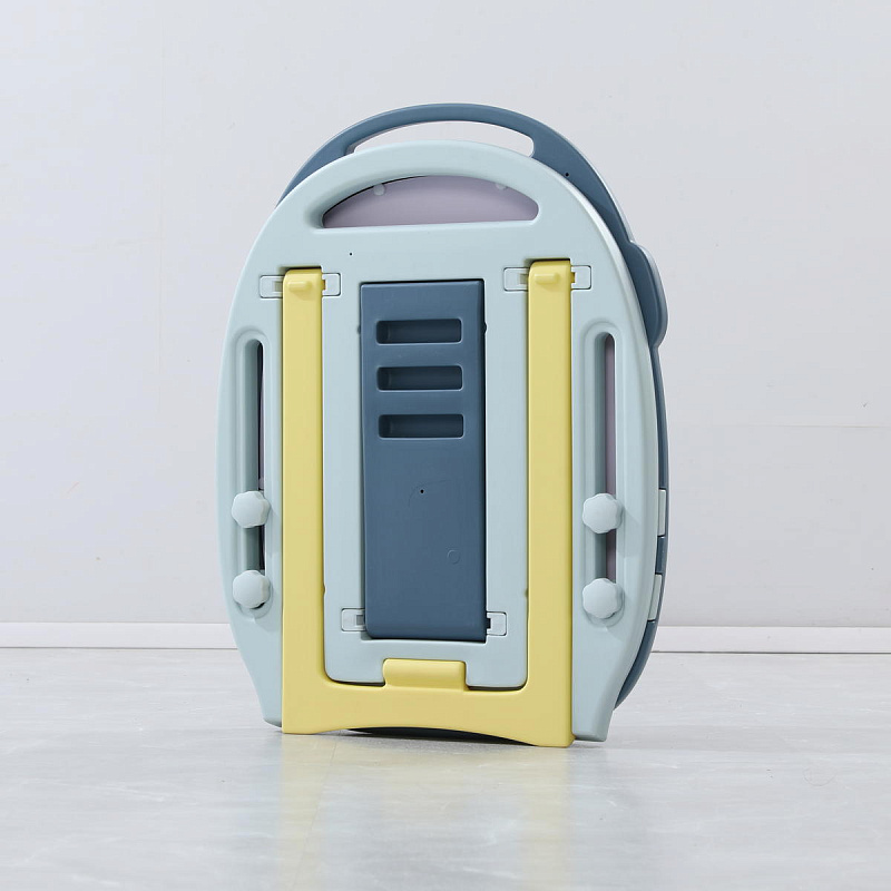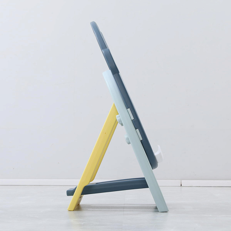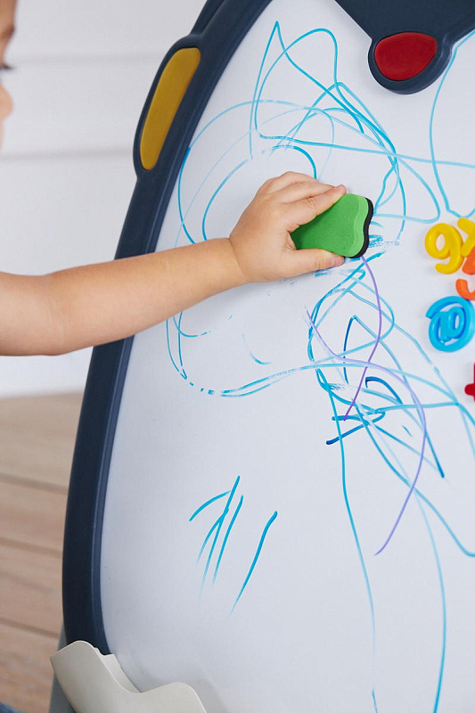 Мольберт имеет несколько регулировок по высоте, легко складывается и имеет удобную ручку для переноски. В основании доски и на передней части имеются места для хранения магнитных деталей, фломастеров и губки для стирания, которые входят в комплект.