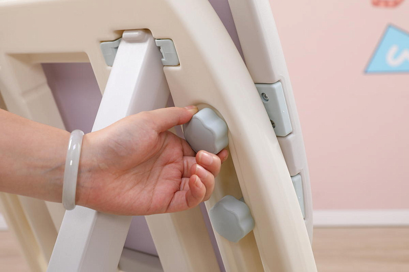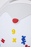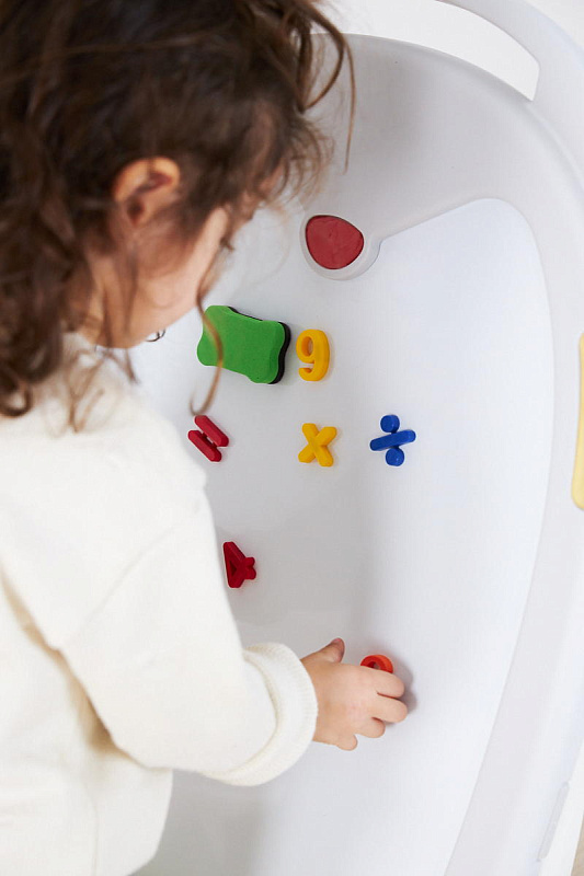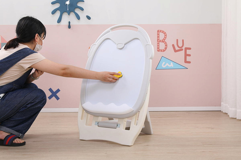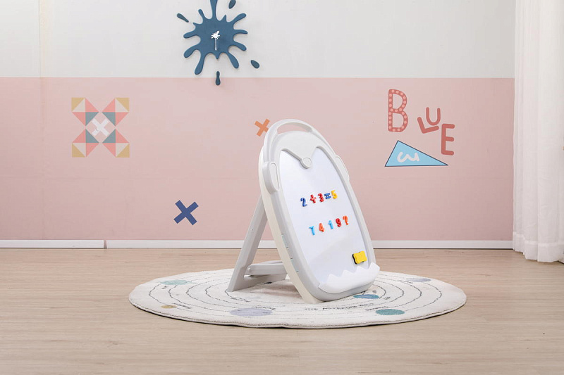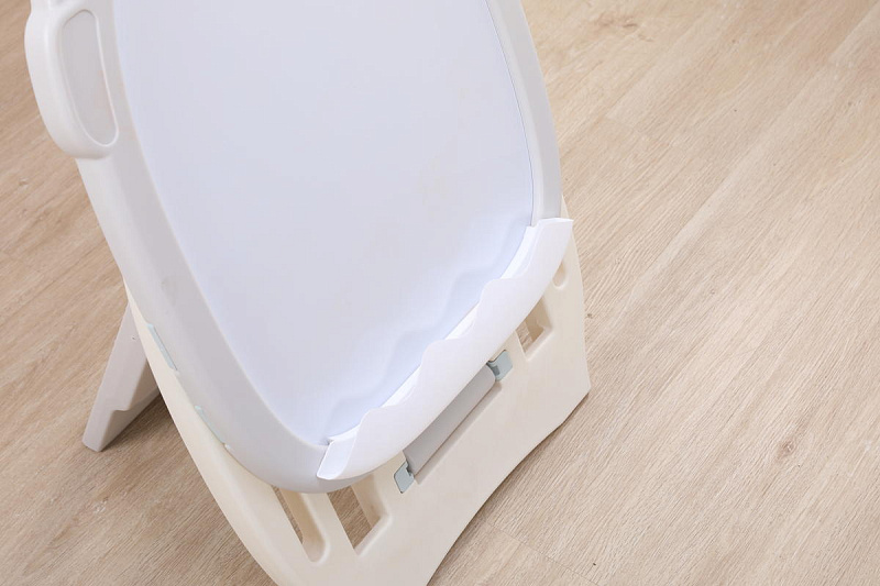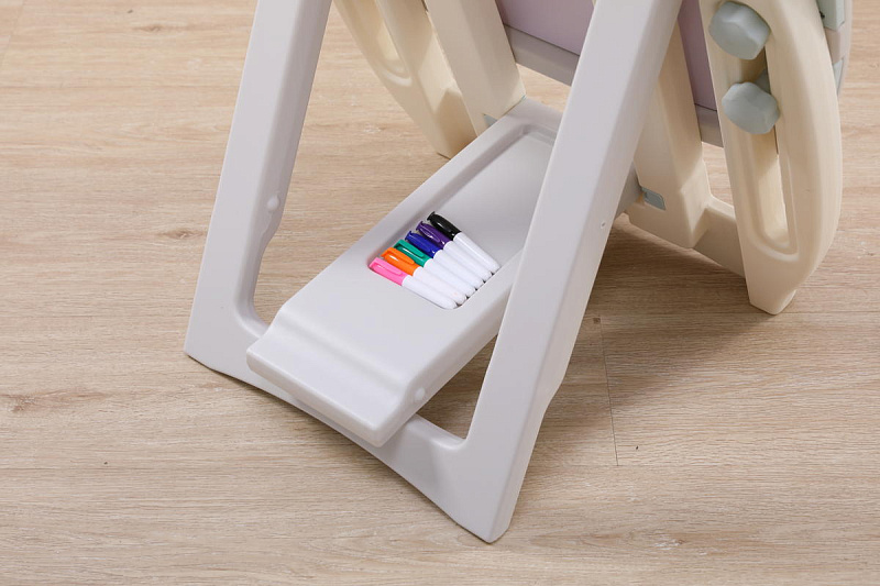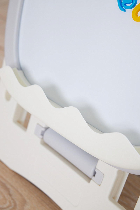 Мольберт имеет несколько регулировок по высоте, легко складывается и имеет удобную ручку для переноски. В основании доски и на передней части имеются места для хранения магнитных деталей, фломастеров и губки для стирания, которые входят в комплект.