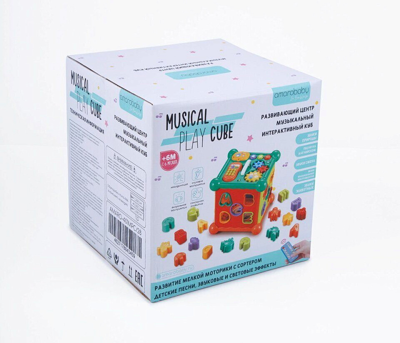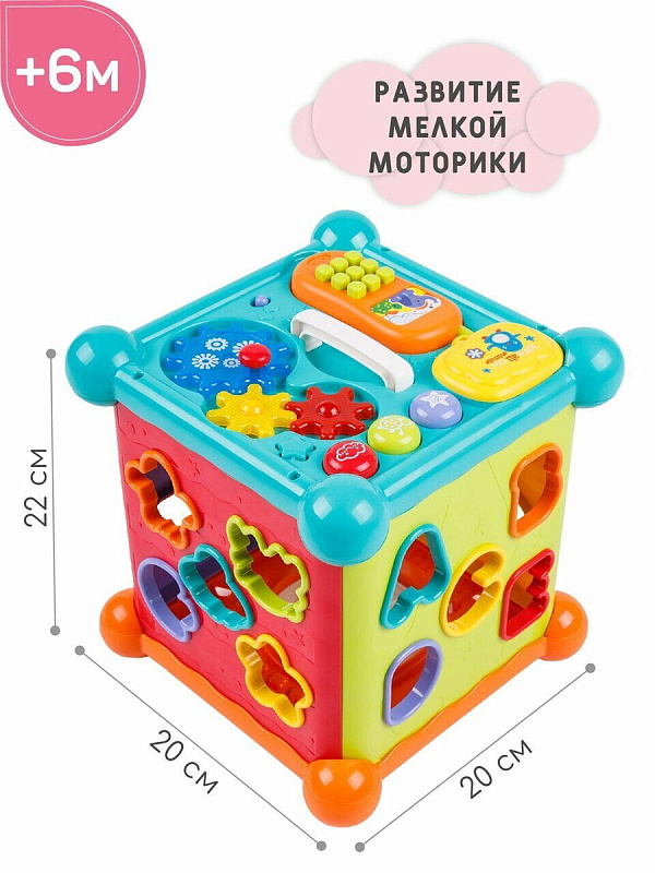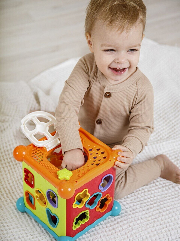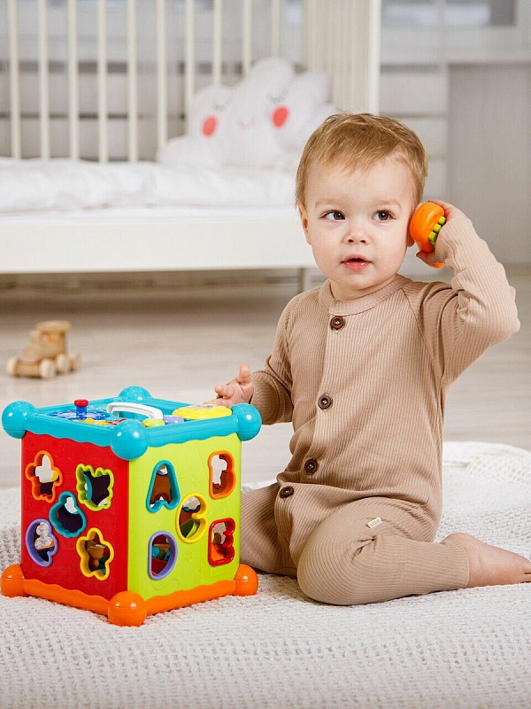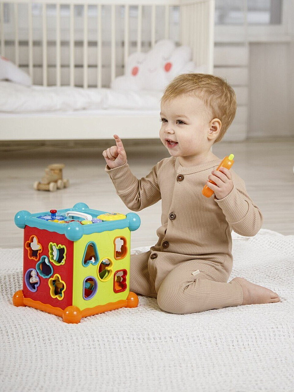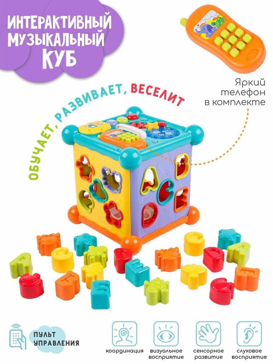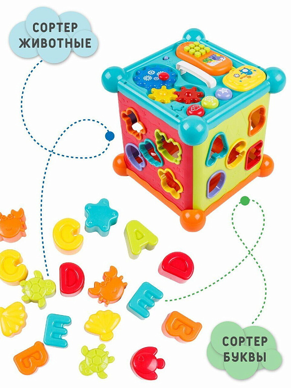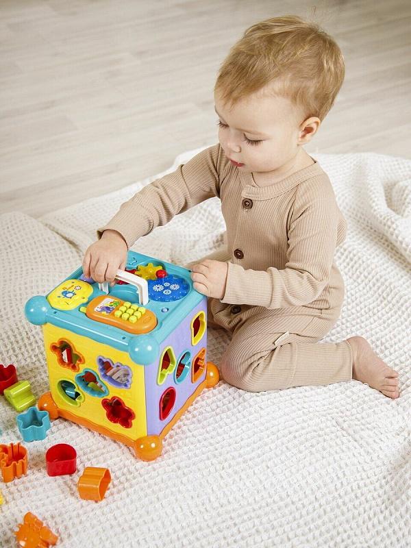 Развивающий интерактивный куб Musical Play Cube. Это многофункциональная музыкальная игрушка, с ярким сортером в виде буковок и животных, так же есть игровая панель со съемным телефоном, музыкальными клавишами и шестеренками. Детский сортер развивает мелкую моторику малыша и является прекрасной развивающей игрушкой. Интерактиваная игрушка станет помощником в развитии малыша от 6 месяцев!