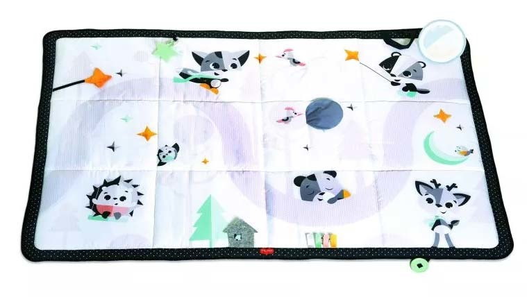 коврик в контрастной расцветке специально разработан для стимуляции зрения в самые первые дни. Множество текстур на игрушках и на самом коврике способствуют развитию тактильных ощущений. Шуршащие элементы развивают слух.