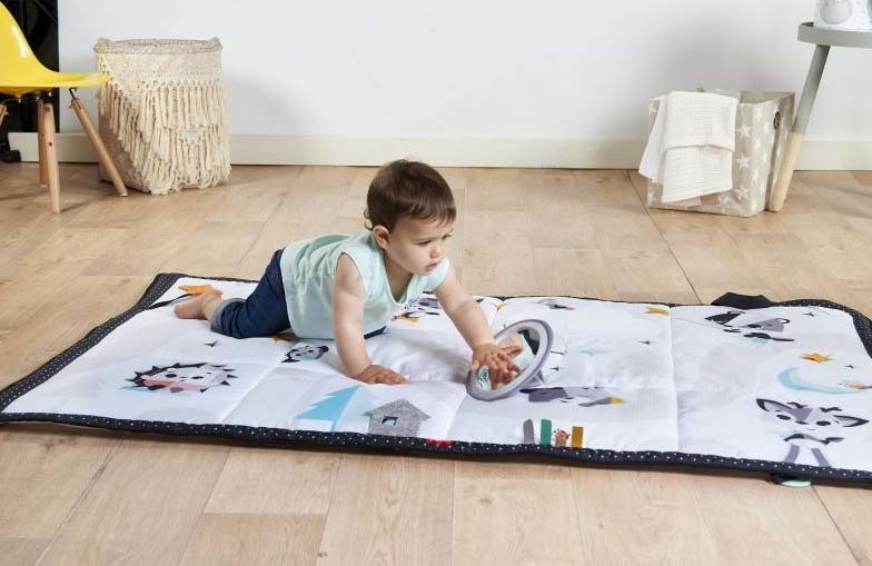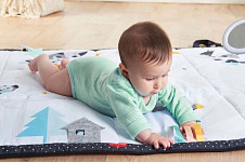 размер коврика позволяет лежать, потягиваться и переворачиваться. Игрушки, встроенные в коврик, книжка и зеркальце способствуют тому, чтобы малыш больше времени проводил на животике.