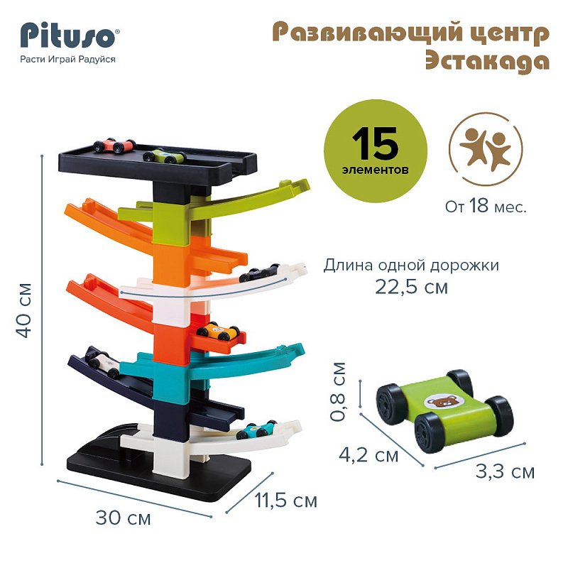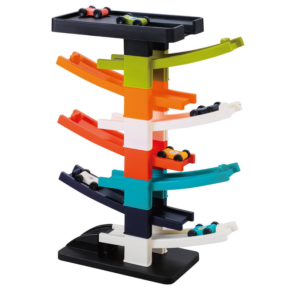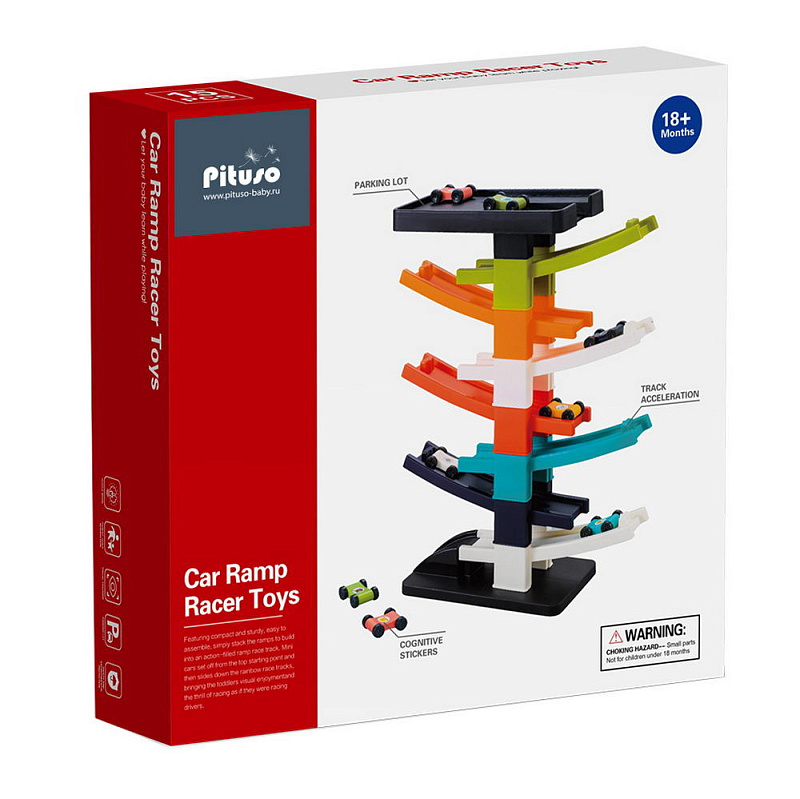 Уникальный игровой набор Эстакада включает в себя многоуровневый игрушечный трек (8 уровней) с трамплинами, разноцветные машинки (6 штук), саму рампу и стартовую парковку.