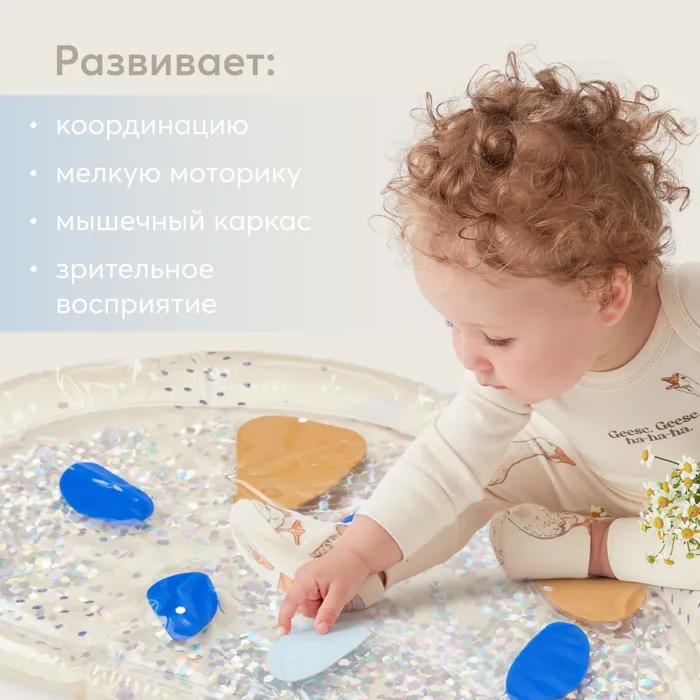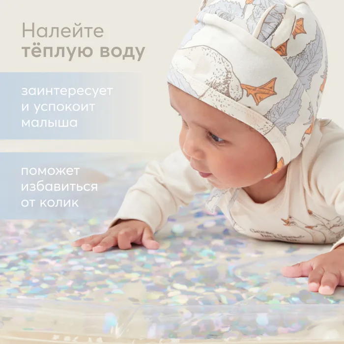 Акваковрик помогает всестороннему развитию ребенка. Отличие водного коврика в том, что изображения на нем не статичны. Игрушки внутри плавают в воде, меняют свое положение, что помогает развивать фокусировку взгляда, зрительное восприятие. Разглядывание блестящих предметов увлечет малыша и даст маме несколько свободных минут. Благодаря компактному размеру коврик удобно брать с собой, а также использовать не только на полу, но и в кроватке или манеже.