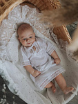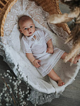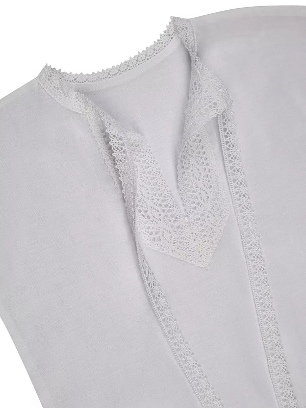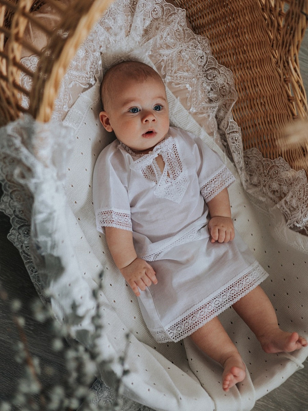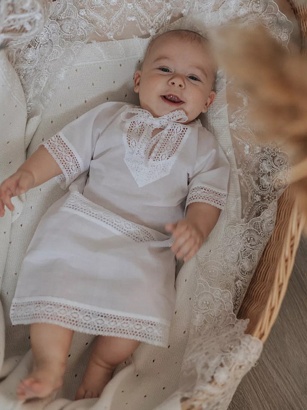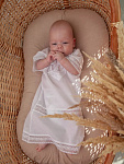 Роскошная крестильная рубашка выполнена из 100% нежнейшего хлопка. Оформлена красивым бежевым кружевом. Модель на завязках спереди для удобного одевания на малыша.