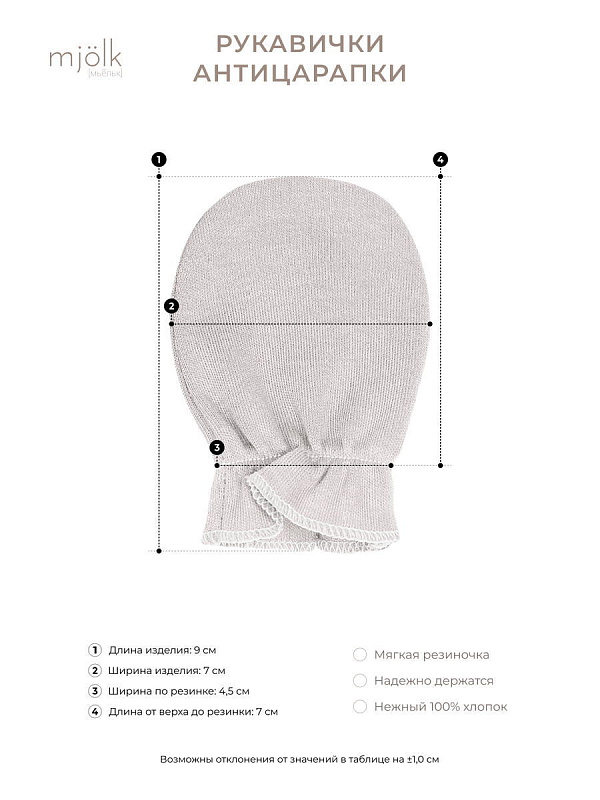 Антицарапки Mjölk [мьёльк] изготовлены из мягкого и приятного на ощупь 100% трикотажного хлопка. Материал эластичный, гипоаллергенный, хорошо сохраняет тепло, при этом пропускает воздух, а также принимает влагу, поэтому рукавички не липнут к коже даже в жаркую погоду.