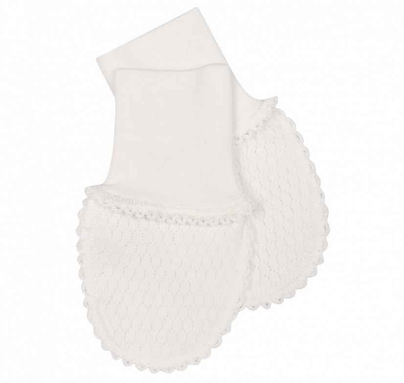 Основная функция рукавичек для новорожденного – предохранение от случайных царапин собственными ногтями. Это миниатюрные варежки без пальчиков с эластичной манжетой, которая препятствует сползанию с руки, ажурная текстура ткани позволяет маленьким ладошкам не потеть в жаркий летний период.