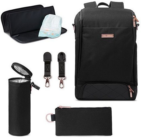 - комплектация: рюкзак для пеленания, чехол для бутылочки, пеленальный коврик, косметичка, универсальные крепления