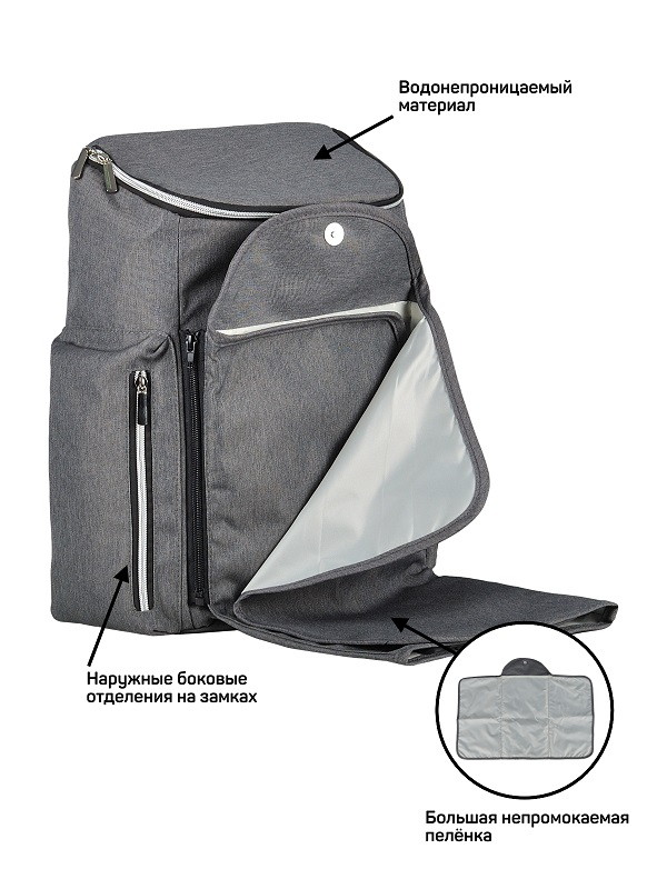 Многофункциональный и удобный рюкзак станет незаменим помощником для родителей. Главная особенность этой модели в наличии большой непромокаемой пелёнки, которая замаскирована под отделение на кнопке и надёжно крепится к рюкзаку.