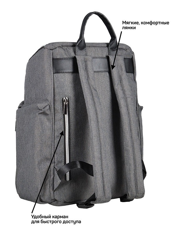 - рюкзак можно носить и на плечах (регулируемые по высоте плечевые ремни мягкие и широкие, не перетирают во время использования) или в руках в виде сумочки