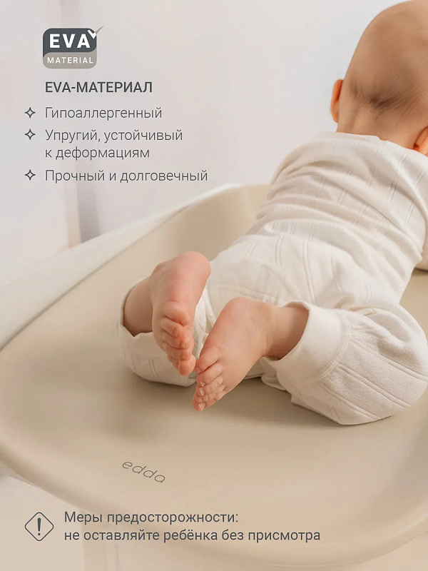 Пеленальный матрасик edda — это практичный и современный аксессуар для ухода за ребёнком. Матрасик выполнен из упругого, гипоаллергенного EVA-материала с эффектом ComfortWarm, поэтому его поверхность всегда мягкая и тёплая. Он прост в уходе: его достаточно протереть влажной салфеткой. Антискользящая поверхность и высокие бортики обеспечивают безопасность и удобное положение во время гигиенических процедур, пеленания или массажа.