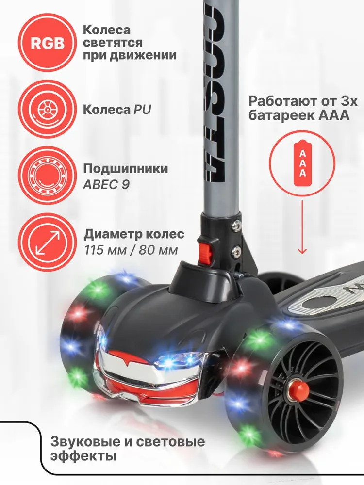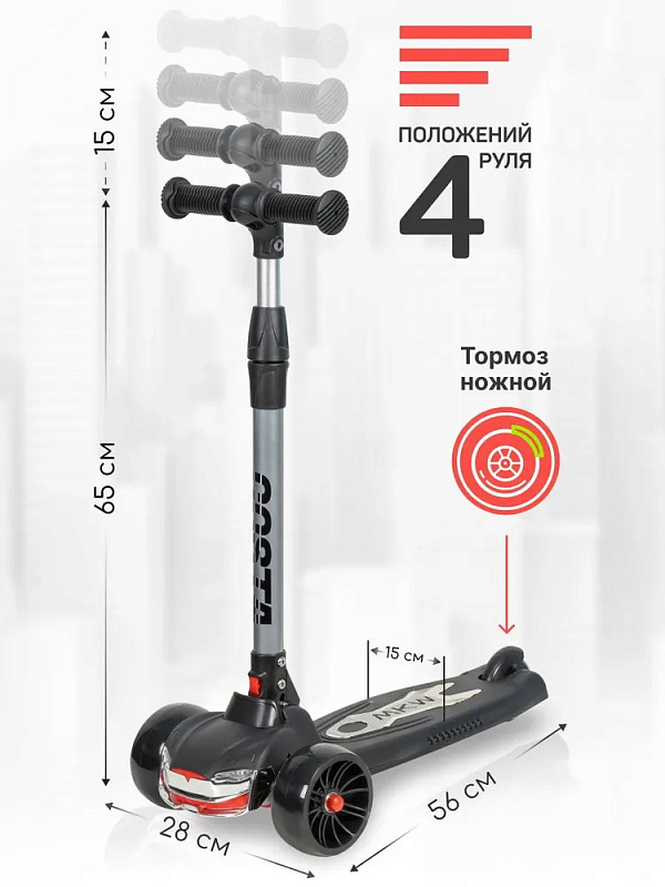 - Стильный дизайн: Имитация машинки в передней части самоката привлечет внимание вашего ребенка и сделает прогулки еще более увлекательными