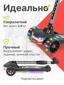 - Световые и звуковые эффекты: Самокат оснащен звуковыми и световыми эффектами, которые работают от 3 батареек ААА (в комплект не входят). Колеса светятся при движении, а подсветка деки добавляет яркости в вечернее время.