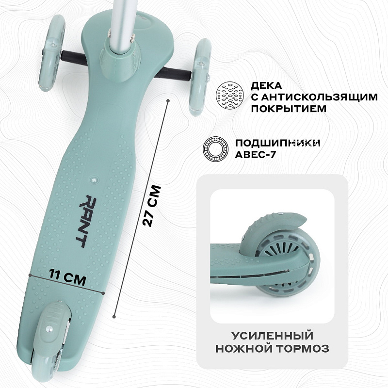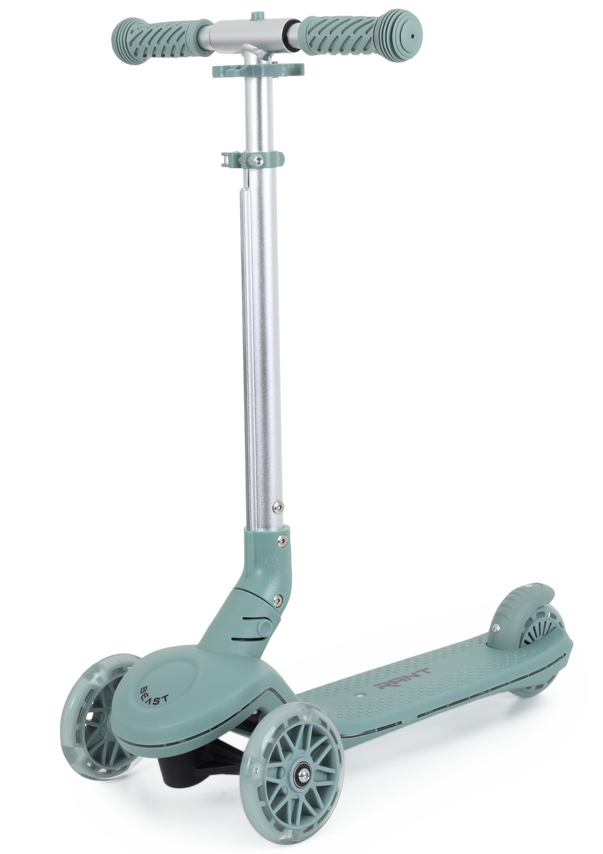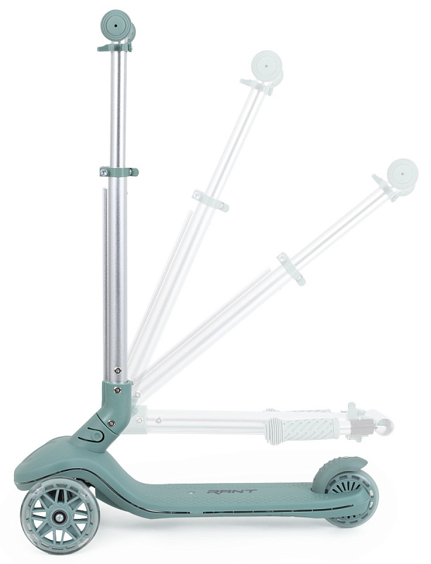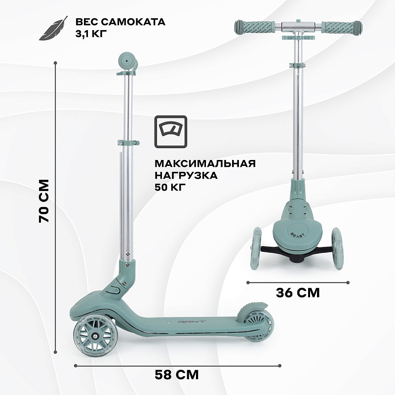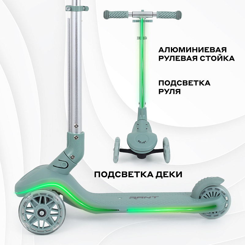 Самокат RANT BEAST обязательно станет надежным спутником юного райдера! Уникальность скутера в эффектной подсветке при движении (колеса, рулевая стойка, дека), элементарной системе складывания (Rotation Folding System) и мегакомпактности в сложенном виде, а также в широком диапазоне применения (максимальная нагрузка - 50 кг).