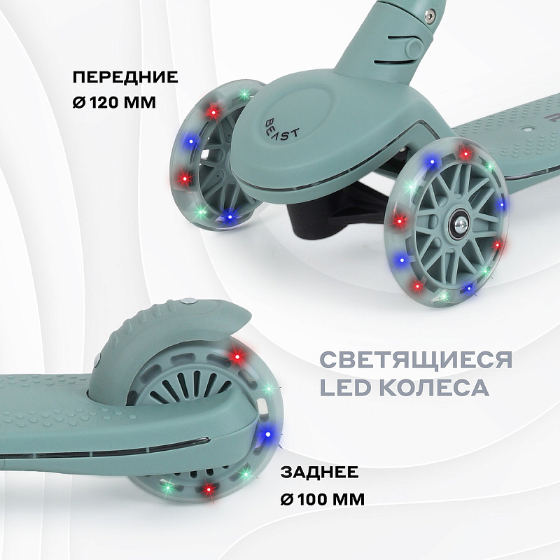 ребенку гарантировано эффектное катание, ведь скут дополнен: светящимися LED-колесами, подсветкой стойки, подсветкой деки (при движении и без аккумуляторов)