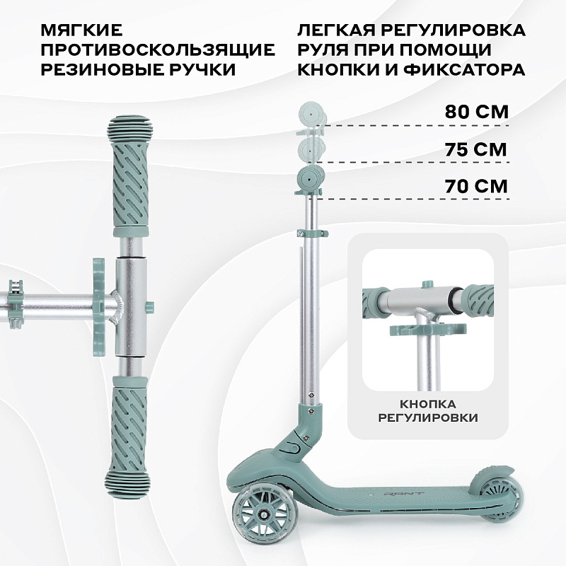 рулевая телескопическая стойка удобно регулируется (кнопка + фиксатор) и надежно фиксируется в нескольких положениях - самокат за секунду подстроится под нужный рост