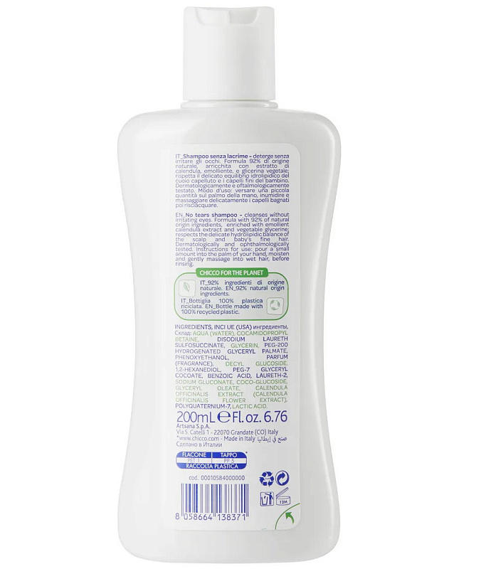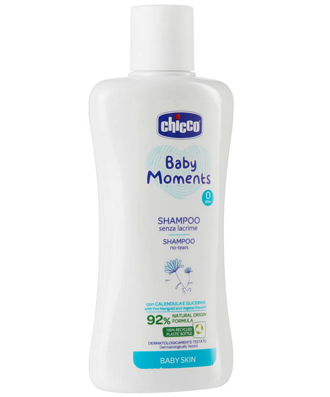 Детский гипоаллергенный шампунь для волос с экстрактом календулы для детей с рождения идеально подходит для новорожденных, для малышей постарше и для всей семьи. Входящий в состав экстракт календулы обладает успокаивающим и противовоспалительными свойствами. Формула "без слез" не раздражает глазки и не вызывает покраснение. Мягкое средство для купания младенцев прошло клинические испытания и не содержит спирт, красителей, парабенов. Упаковка средства на 100% состоит из переработанного пищевого пластика и пригодна к повторной переработке. Косметика Chicco Baby Moments создана обеспечить бережный,безопасный уход за малышом с самого рождения. Все средства Chicco Baby Moments производятся в Италии,не содержат парабенов, не содержат лаурил- и лауретсульфатов натрия (SLS/SLES), содержат увлажняющие растительные ингредиенты, клинически протестированы для чувствительной кожи и являются гипоаллергенными