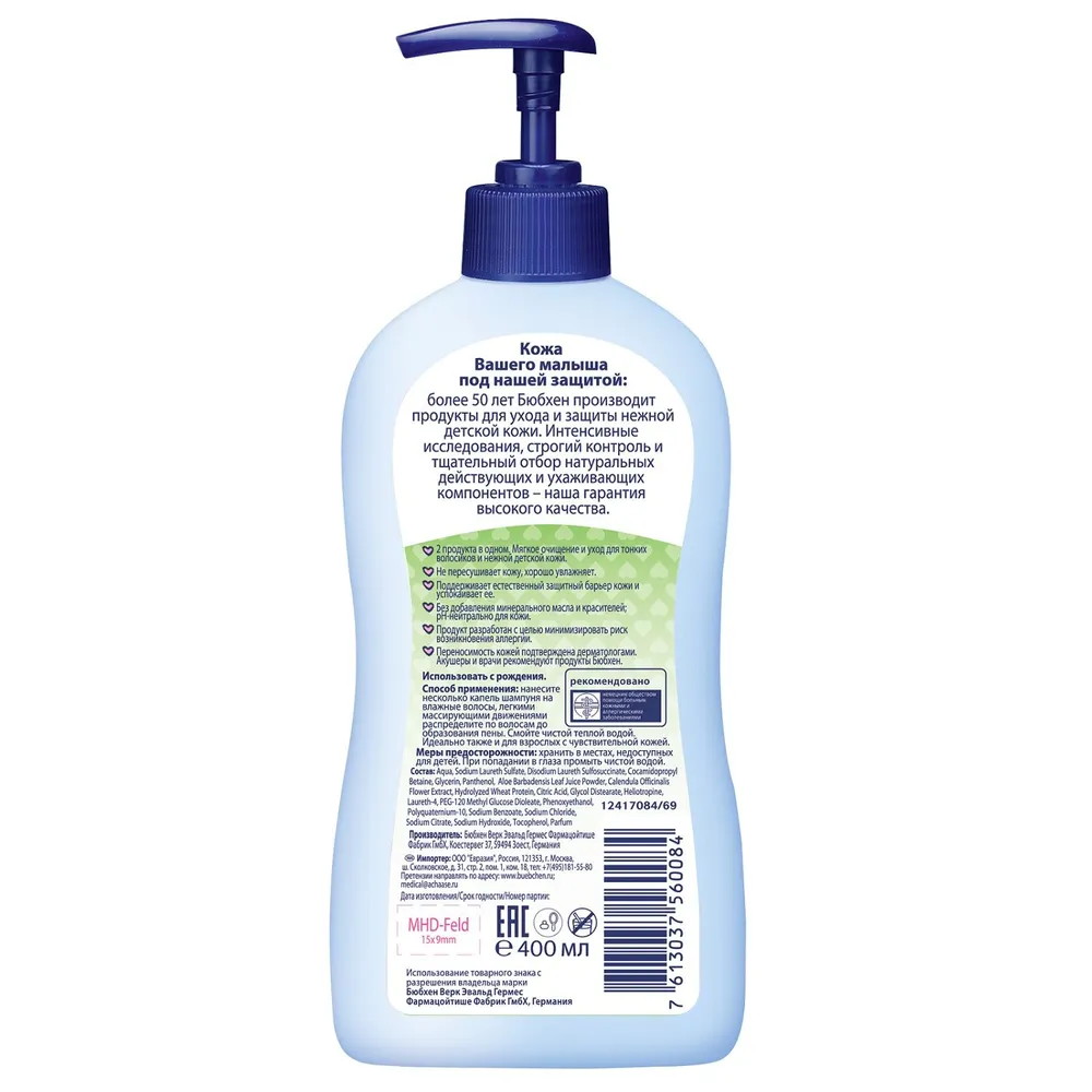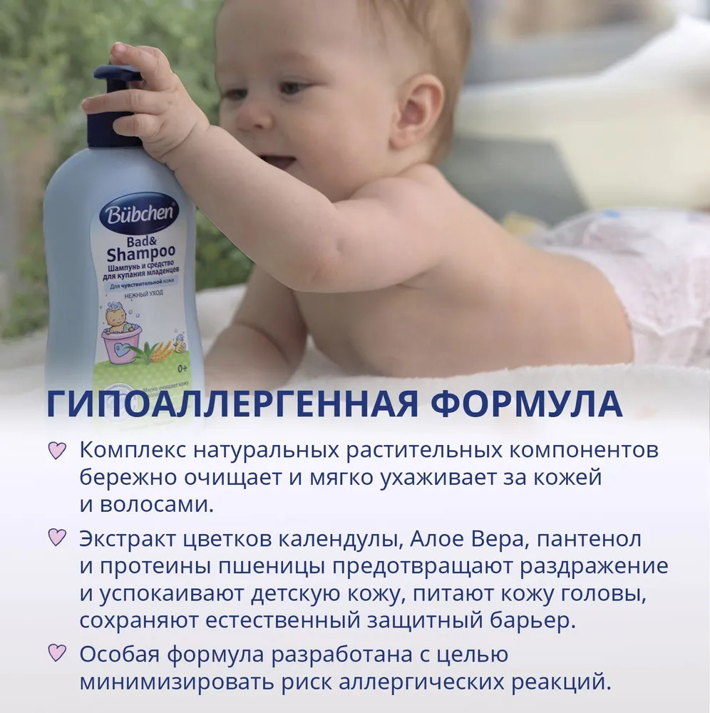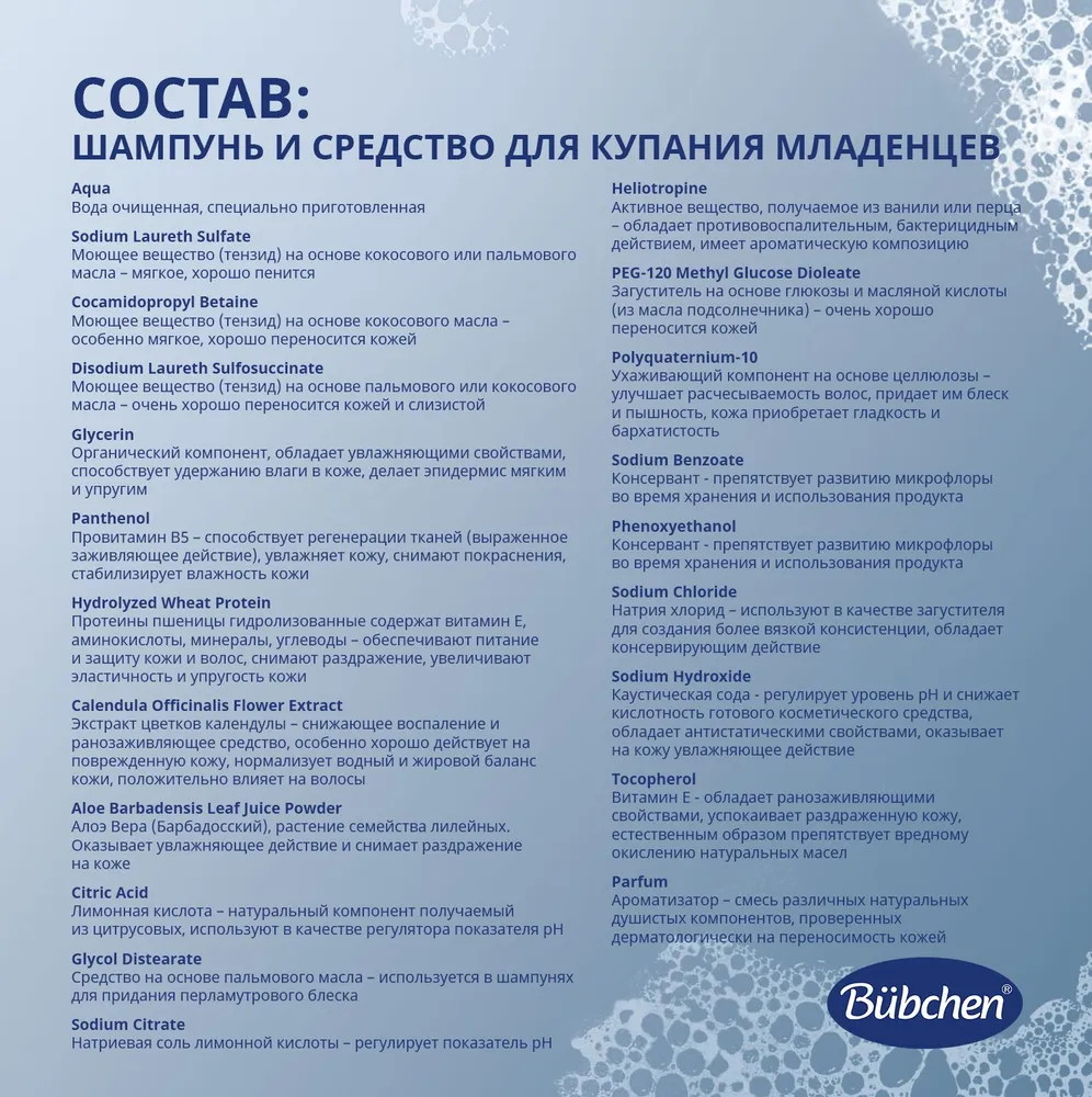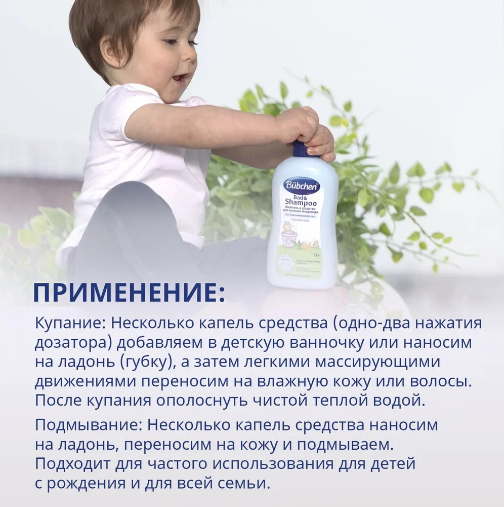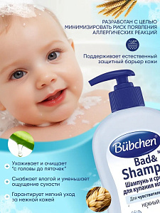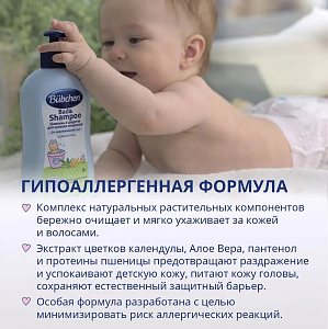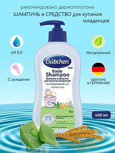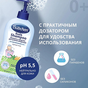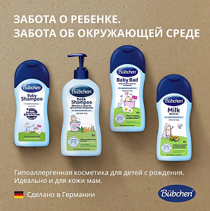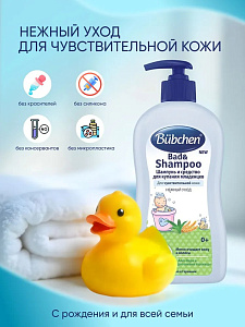 Два в одном: продукт бережно очищает и мягко ухаживает как за волосами, так и за нежной кожей. Сохраняет естественный защитный барьер и успокаивает детскую кожу. Врачи-окулисты подтвердили, что шампунь не вызывает слез. Акушеры и врачи рекомендуют Бюбхен. Несколько капель этого продукта, добавленные в воду, позволят и маме насладиться успокаивающей ванной.