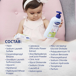 - Применение: Добавить небольшое количество средства в детскую ванночку или несколько капель распределить между ладонями, нанести на влажные волосы и тело, вспенить. Смыть чистой водой. Подходит для ежедневного использования.