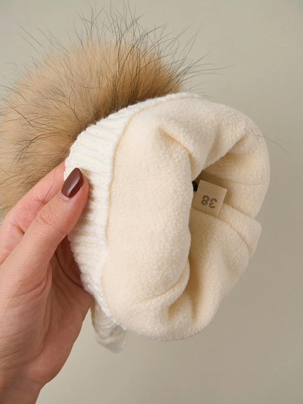 Зимняя шапочка с подкладой из флиса и натуральным бумбоном из меха енота.