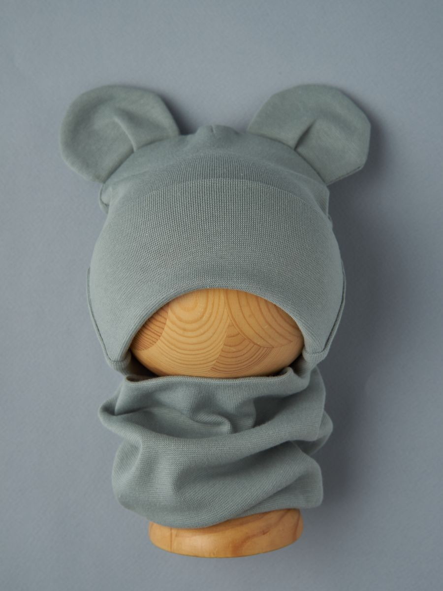 Шапка-котелок и снуд Little Star Мишка рибана начес 80932 олива 36